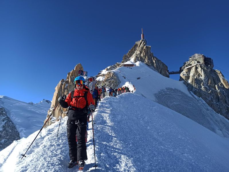 Das Highlight des verlängerten Wochenendes war die Abfahrt durch das Mer de Glace von der Aiguille du Midi. Morgens war der Blick in die Berge noch von tiefhängenden Wolken verwehrt, so dass nicht einmal die Seilbahnen auf die Aiguille du Midi (3842 m) fuhren. Die Wartezeit haben einige der Teilnehmer mit einem Espresso und einem Croissant in einem kleinen Café in Chamonix überbrückt. Die Fahrt mit der Seilbahn war dann tatsächlich wenig vielversprechend und erst kurz unterhalb der Bergstation haben wir die Wolkendecke durchbrochen und fuhren direkt in den blauen Himmel – Leo hatte also den richtigen Riecher. Nach dem obligatorischen Besuch auf der Aussichtsterrasse mit einem faszinierenden Blick auf das Wolkenmeer unter uns und beispielsweise auf das Matterhorn ging es über Schneestufen zum Einstieg in das Vallée Blanche.