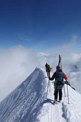 Am Skidepot angekommen wollten wir zuerst direkt auf den Grat gelangen. Jedoch gestaltete sich das schwierig. Nur ich hatte Steigeisen eingepackt, ohne die es auf Grund des wenigen Schnees und des lockeren Gesteins schwierig geworden wäre. So kehrten wir zum Skidepot zurück und nahmen den Normalweg auf den Grat und schließlich auf den Gipfel. Oben bot sich im nahezu windstillen eine atemberaubende Aussicht. Obwohl wir nur auf 3584m waren lagen doch die aller meisten Berge unter uns. Eine perfekte Gelegenheit um mit unserem Gaskocher eine Zwiebelsuppe zuzubereiten.