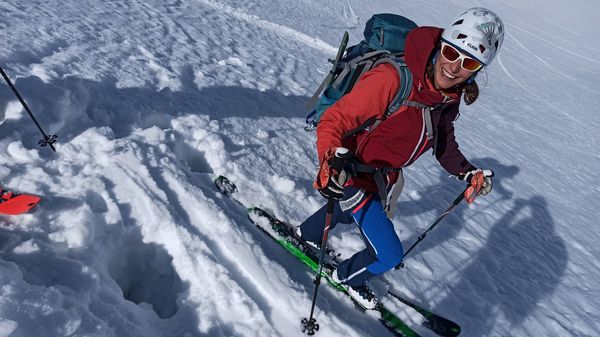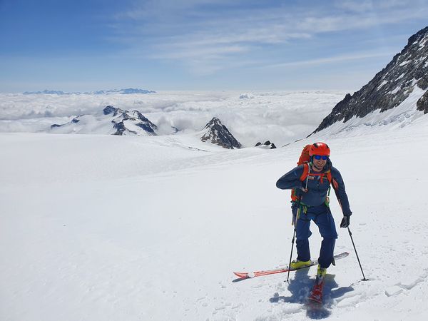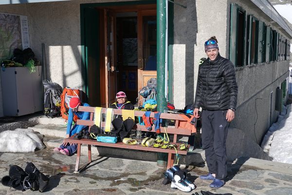 Unten angekommen bot sich abermals ein wunderschöner Anblick über die Gletscher und Berge. Und – endlich – gab es eine super lohnende Abfahrt über den aufgefirnten Gletscher Vedretta di Scerscen. So genossen wir die flache, über 6km lange Abfahrt bevor wir nochmal auffellen und die letzten 400 Höhenmeter zur Hütte aufsteigen mussten. Die Auffellpause nutzen wir auch um uns im Gletscherbach etwas frisch zu machen und das ein oder andere Kleidungsstück einmal durchzuwaschen. Der Aufstieg machte sehr viel Spaß. Im Gegensatz zu den Gletschertouren ging es diesmal recht eng und steil zu. Wir ließen uns Zeit – denn schwitzen wollte nach dem Waschen keiner mehr...