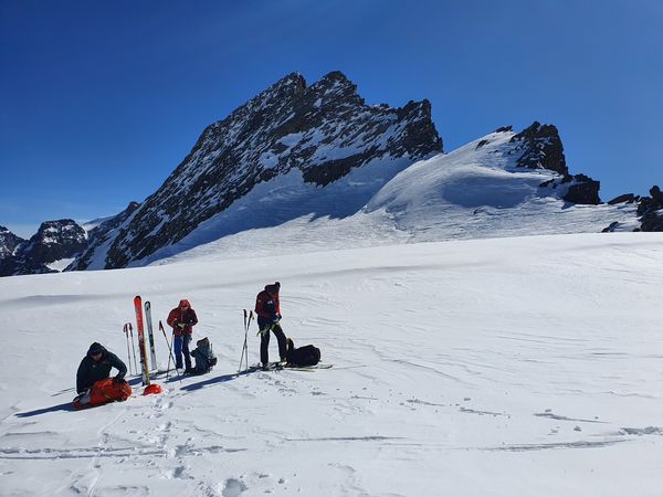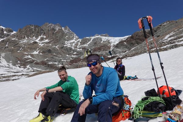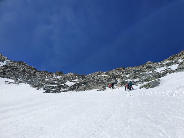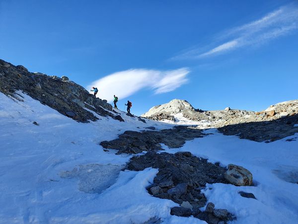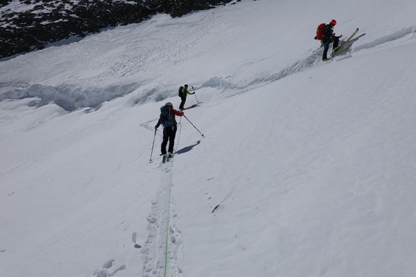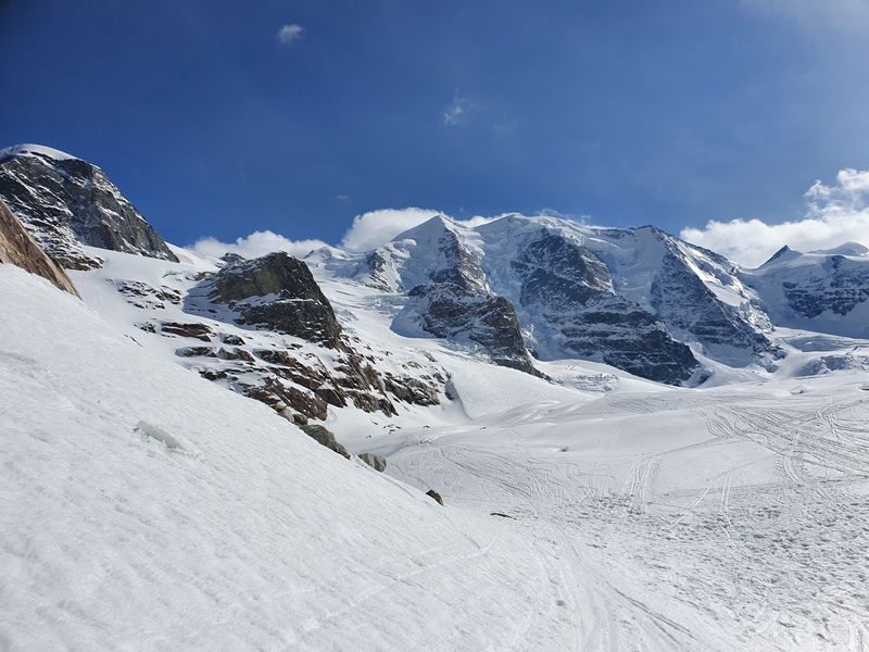 Am Sonntag stand eigentlich wegen seines spannenden Gratzustiegs der Piz Glüschaint (3594m) auf dem Programm. Auf Grund der sehr spärlichen Schneelage ist dieses Jahr war der Gletscherbruch jedoch kaum zu überwinden, so dass wir uns Richtung La Sella (3584m) aufmachten.