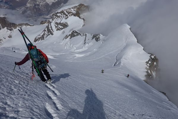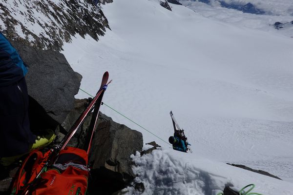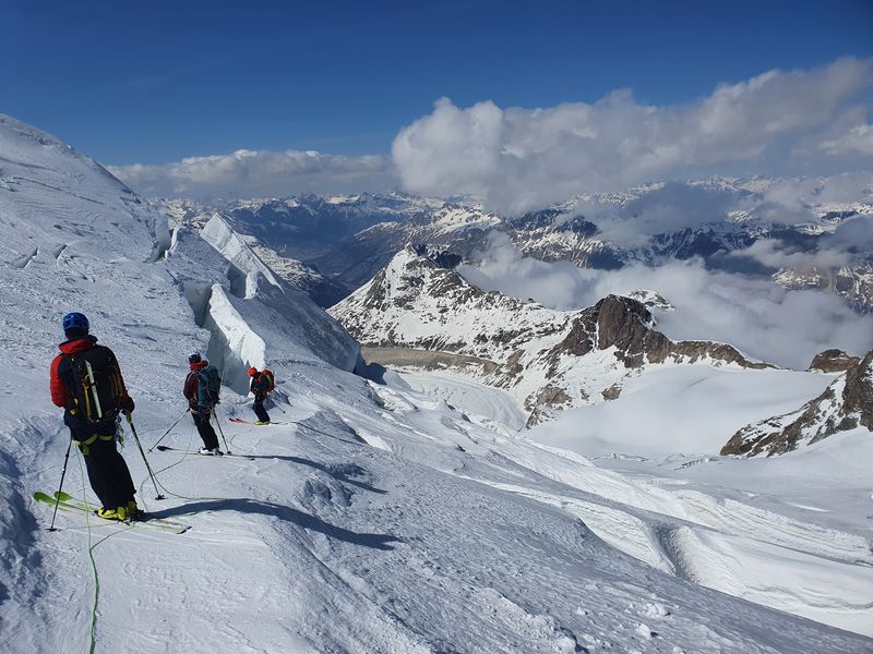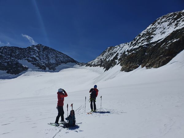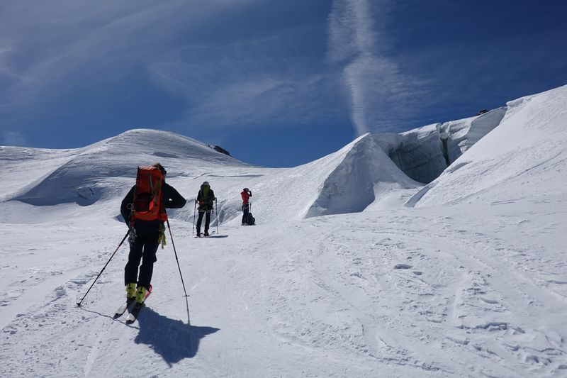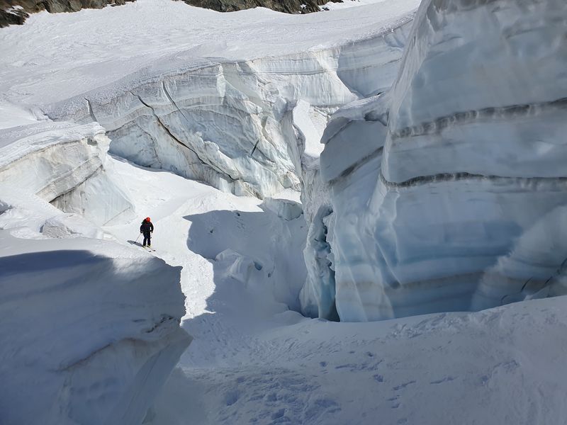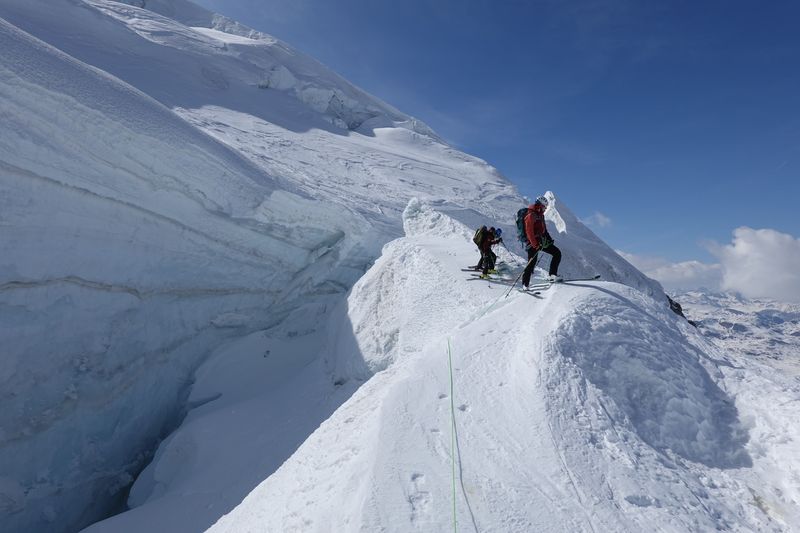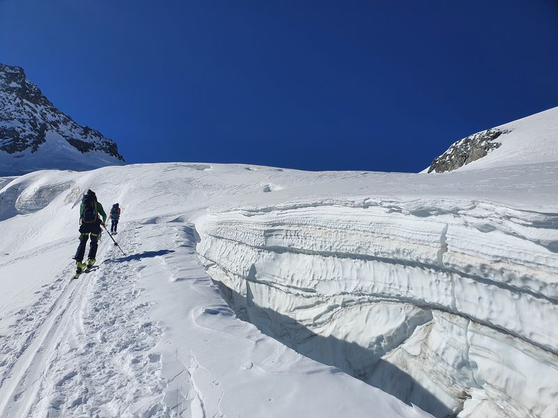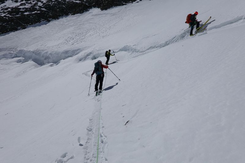 Und die Abfahrt setzte nochmal einen oben drauf: Die Wegführung durch den eh schon zerklüfteten Gelscherbruch war dieses Jahr mit dem wenigen Schnee unglaublich: Bergführer haben Absätze in die Spaltenränder geschlagen um den Weg überhaupt möglich zu machen. Einmal mussten wir gar auf den Boden einer breiten Glescherspalte fahren um an deren Ende wieder „ausgespuckt“ zu werden. Die Abfahrt zum letzten Aufstieg unserer Tour war ebenfalls einfach paradiesisch. Sonne, warm, weicher Schnee, beeindruckender Ausblick – was will man mehr.