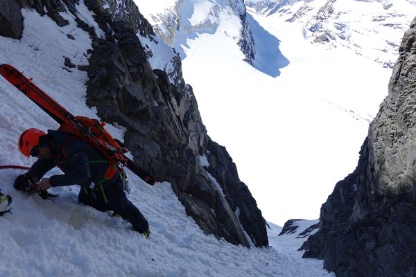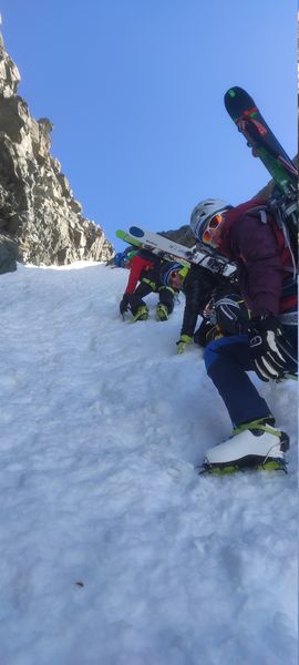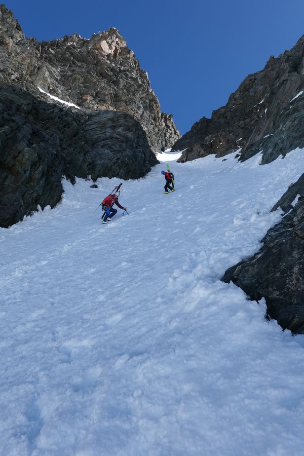 Unsere Hoffnung, dass wir die Süd-West exponierte Rinne in aufgefirngem Schnee abfahren könnten zerschlug sich leider. Es war sehr hart und es lagen auch zu viele Schneebrocken verteilt, so dass wir am Ende des Trichters die Ski auf den Rucksack packten und uns mit Steigeisen und Pickel bestückt zu Fuß auf die 200 Höhenmeter Abstieg machten.