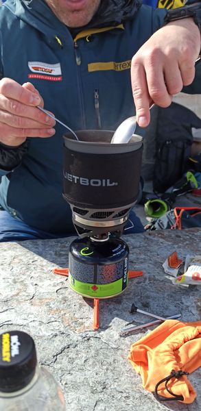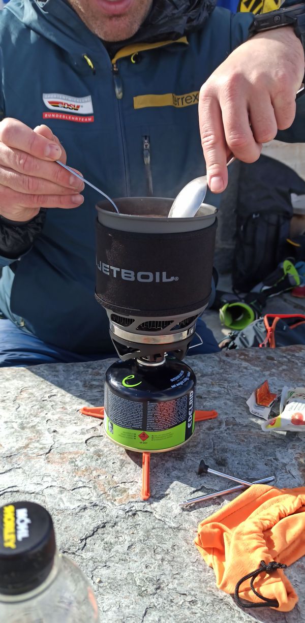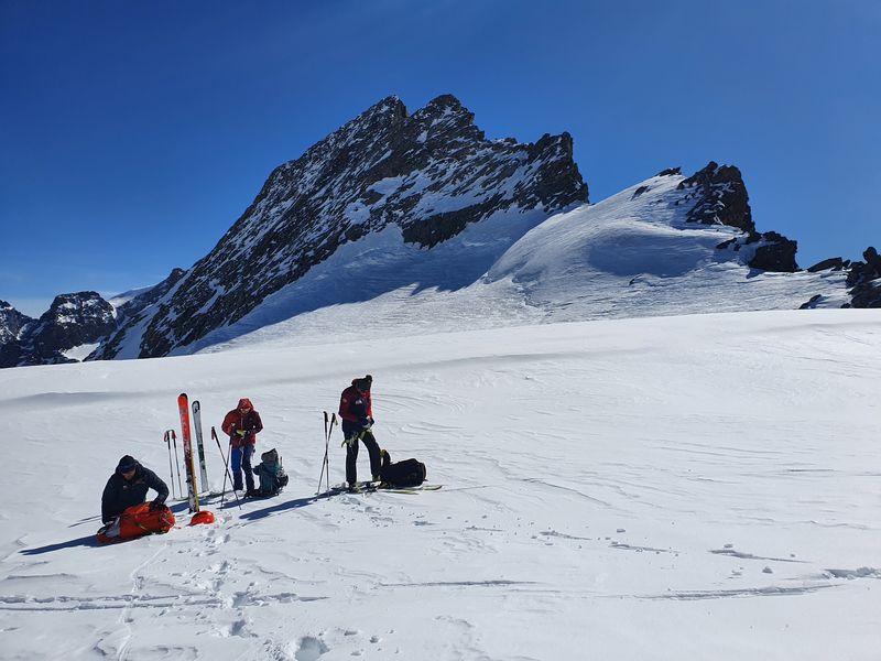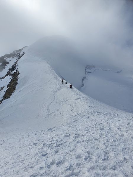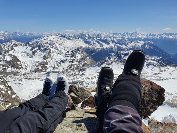 Am Skidepot angekommen wollten wir zuerst direkt auf den Grat gelangen. Jedoch gestaltete sich das schwierig. Nur ich hatte Steigeisen eingepackt, ohne die es auf Grund des wenigen Schnees und des lockeren Gesteins schwierig geworden wäre. So kehrten wir zum Skidepot zurück und nahmen den Normalweg auf den Grat und schließlich auf den Gipfel. Oben bot sich im nahezu windstillen eine atemberaubende Aussicht. Obwohl wir nur auf 3584m waren lagen doch die aller meisten Berge unter uns. Eine perfekte Gelegenheit um mit unserem Gaskocher eine Zwiebelsuppe zuzubereiten.