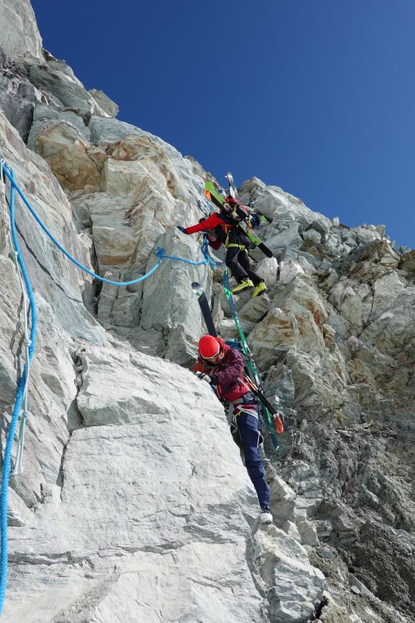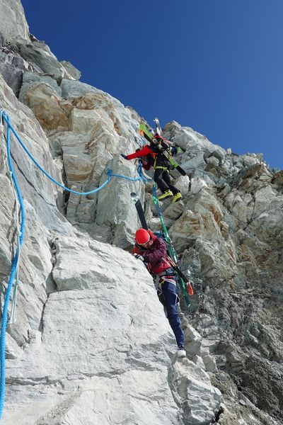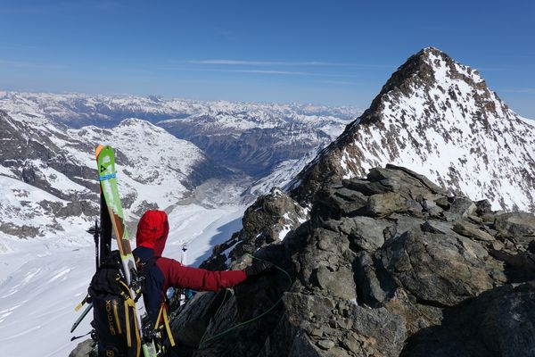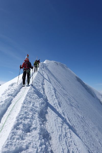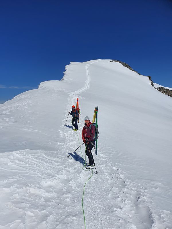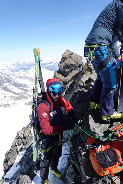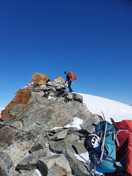 Am Piz dal Lej Alv vorbei ging es über ein kurzes Gletscherstück zum Skidepot des Il Chapütschin (3388m). Dort kurz die Ski auf den Rücksack gepackt und weiter geht es über den einfachen Nord-Grat auf den Gipfel. Um es interessant zu halten gingen wir nun den Grat Richtung Süd-Westen weiter. Anfangs recht leicht musste gegen Ende etwas abgeklettert (UIAA 2) werden.
