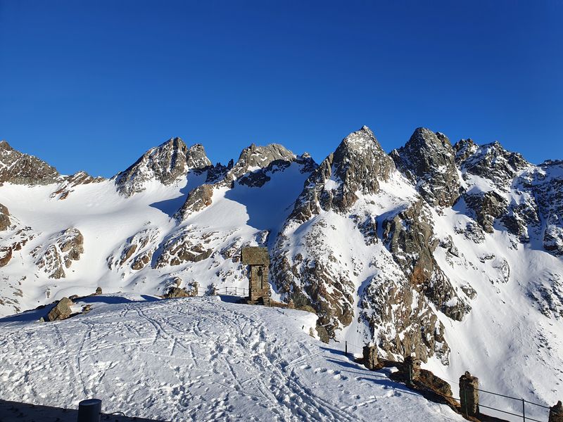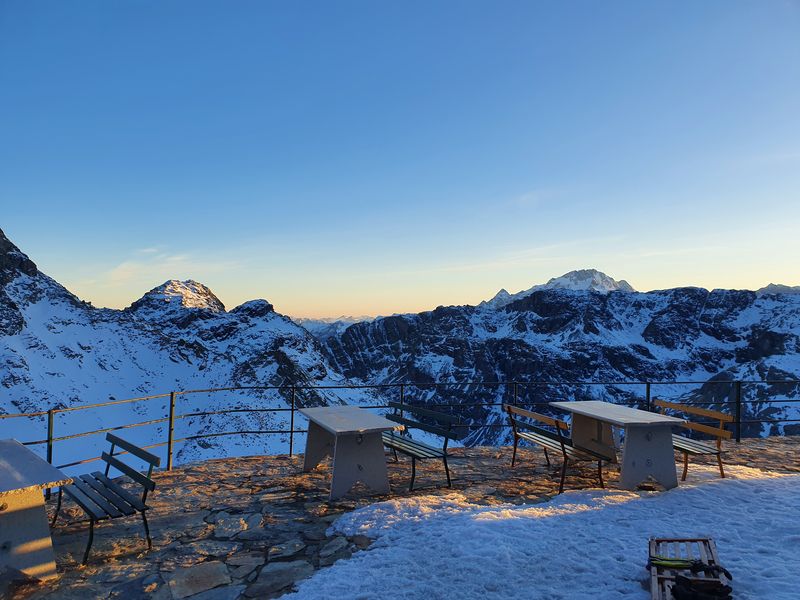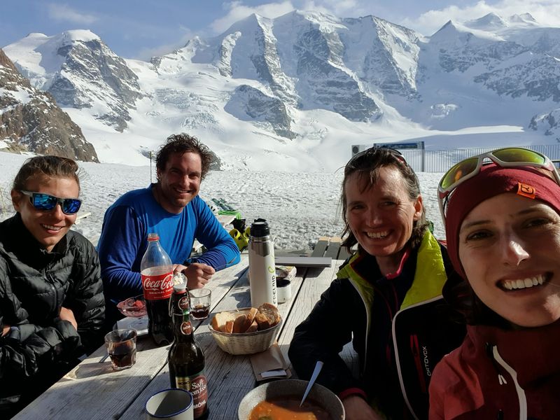 Die 200 Höhenmeter vom Gletscher hoch zur Bergstation des Skigebiets der Diavolezza (2972m) zogen sich nochmals. Oben angekommen fanden wir jedoch einen gebührenden Abschluss: Alle Skitouristen waren schon weg – dennoch gab es für uns auf der Terrasse des Bergrestaurants Minestrone, Eis und Cola (leider wieder zu schweizer Preisen).