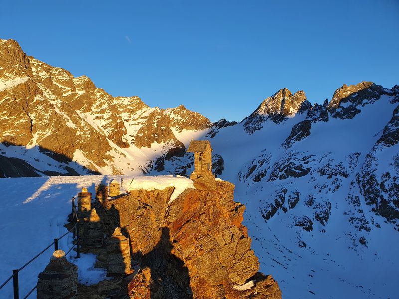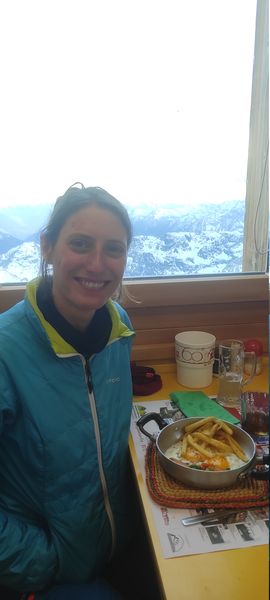 Die Marinelli-Hütte liegt sehr exponiert auf einem Felsgrat und nach wenigen Metern Fußweg kann man sogar die Südwand des Piz Bernina sehen. Bei unserer Ankunft war gerade eine Rettungsaktion am Piz Bernin in Gange. Anfangs wusste niemand so recht was los war – auch die zwei an der Hütte vom Helikopter zurückgelassenen Besatzungsmitglieder wussten nichts genaueres: Zwei durch die Südwand aufgestiegenen Kletterer wurden wohl beim Absturz beobachtet und der Heli war auf der Suche nach ihnen. Dementsprechend gedrückt und angespannt war die Atmosphäre. Umso schöner war die Erleichterung, als der Heli die erste Bergsteigerin unversehrt zur Hütte brachte. Es stellte sich heraus, dass sie erfolgreich die Südwand durchstiegen hatten und erst bei der Ski-Abfahrt der Begleiter gestürzt war. Er zog sich eine Beinbruch zu und wurde direkt ins Spital geflogen. Dennoch war das sehr erleichternd. Die restliche Zeit verbrachten wir barfuß und in kurzen Hosen auf der Sonnenterrasse und ließen es uns gut gehen – was bei italienischen Hüttenpreisen nun deutlich entspannter gelang :-)