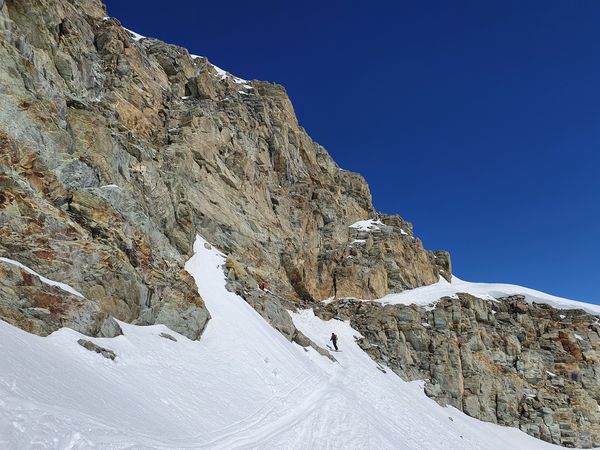 Doch nicht nur das, danach ging es über einen 50m langen sehr steilen Osthang Richtung Grat. Auch hier lag extrem wenig Schnee und es stellte sich leider heraus, dass dieser zu locker war und das darunter liegende Gestein zu lose für einen sicheren Aufstieg ist. So kam es, dass wir nach 2h den Überschreitungsversuch abbrechen mussten und den Umweg über die Bellavista-Terrasse (eine sehr ausgesetzte Traverse) zur Hütte wählen mussten.